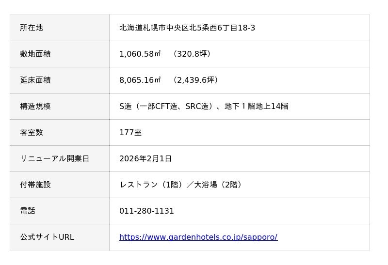 三井不動産株式会社(本社:東京都中央区、代表取締役社長:植田 俊)および株式会社三井不動産ホテルマネジメント(本社:東京都中央区、代表取締役社長:杉山 亮)は、「三井ガーデンホテル札幌」(所在:北海道札幌市)のリニューアル工事を完了し、2026年2月1日(日)にリニューアルオープンします。