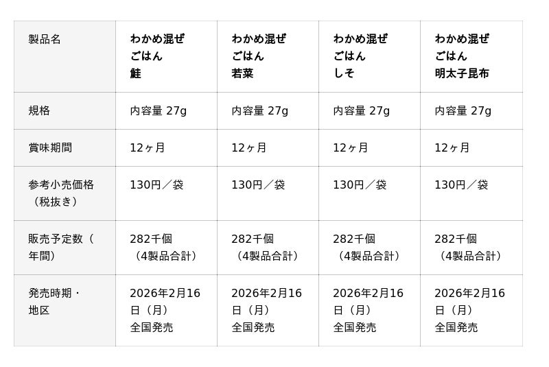 『わかめ混ぜごはん』シリーズは、温かいご飯に混ぜるだけで、わかめの香り豊かなわかめご飯ができあがる混ぜごはんの素です。おむすびやお弁当にお手軽にお使いいただけます。今回は、当社オリジナルで秘伝の味付けを施した"抹茶ごま"をふんだんに配合し、より風味が増す仕様にリニューアルします。新しく鮭フレーバーも追加し、ラインアップも拡充します。