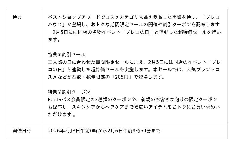 期間中、BEST SHOP AWARD 2024でコスメカテゴリ大賞を受賞した「プレコハウス」や、人気米店「こめたつ」との店舗コラボレーションセールを実施します。人気ブランドコスメなどが型数・数量限定で205円となる割引セールや、令和7年産のブランド米など対象商品が10%割引となるセールなど、家計を応援する特典を多数提供します。