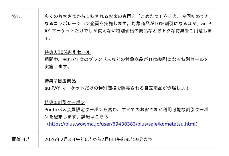 au PAY マーケット、2月3日から6日の三太郎の日・お買い物ラリーは、コスメカテゴリ大賞受賞店やお米のランキング常連店とコラボ!205円コスメや令和7年産のブランド米セールで冬の生活必需品がおトク