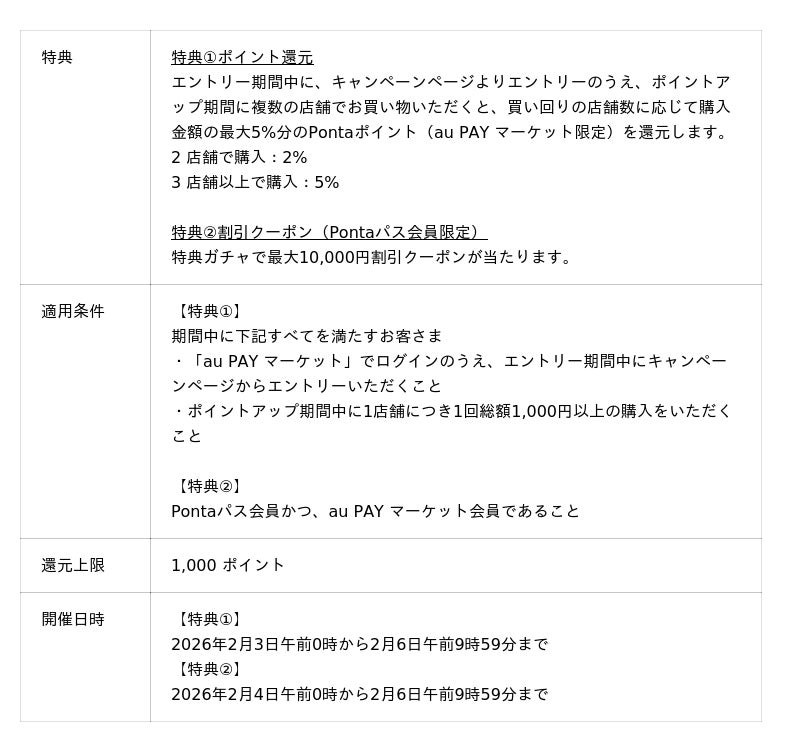 auコマース&ライフは、総合ショッピングサイト「au PAY マーケット」において、2026年2月3日から2月6日までの期間、三太郎の日およびお買い物ラリーを開催します。