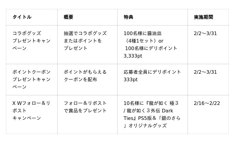 株式会社ライドオンエクスプレスホールディングス(本社:東京都港区、代表取締役社長:江見 朗)は、グループ企業である株式会社ライドオンエクスプレス(以下、当社)が展開する、宅配寿司「銀のさら」(以下、「銀のさら」)において、株式会社セガの人気ゲームシリーズ最新作『龍が如く 極3 / 龍が如く3外伝 Dark Ties』の発売を記念して、4つのコラボレーション企画を2026年2月2日(月)より~開始いたします。