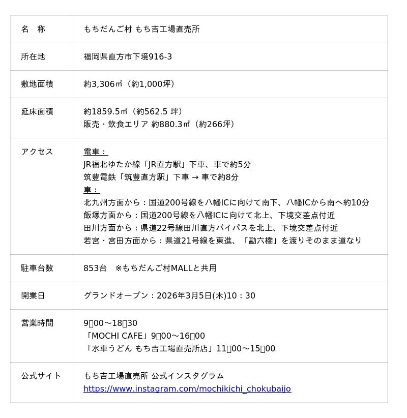 福岡県直方市にあるもちだんご村に「もちだんご村 もち吉工場直売所」を新たにオープンします。