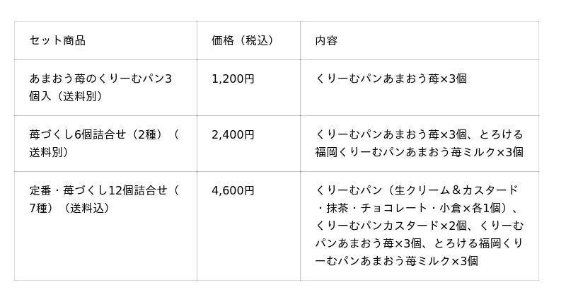 自分へのご褒美スイーツとして気軽に楽しめる「3個入」や、2種を食べ比べできる「苺づくしセット」の他、八天堂くりーむパン定番の5種の味と苺フレーバーの「12個詰合せ」もご用意しています。