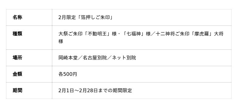 一畑山薬師寺の月替わり限定ご朱印の2月限定ご朱印が公開。「大祭ご朱印」から、不動明王様と七福神様の2種類。十二神将ご朱印から摩虎羅(まこら)大将様の計3種類です。