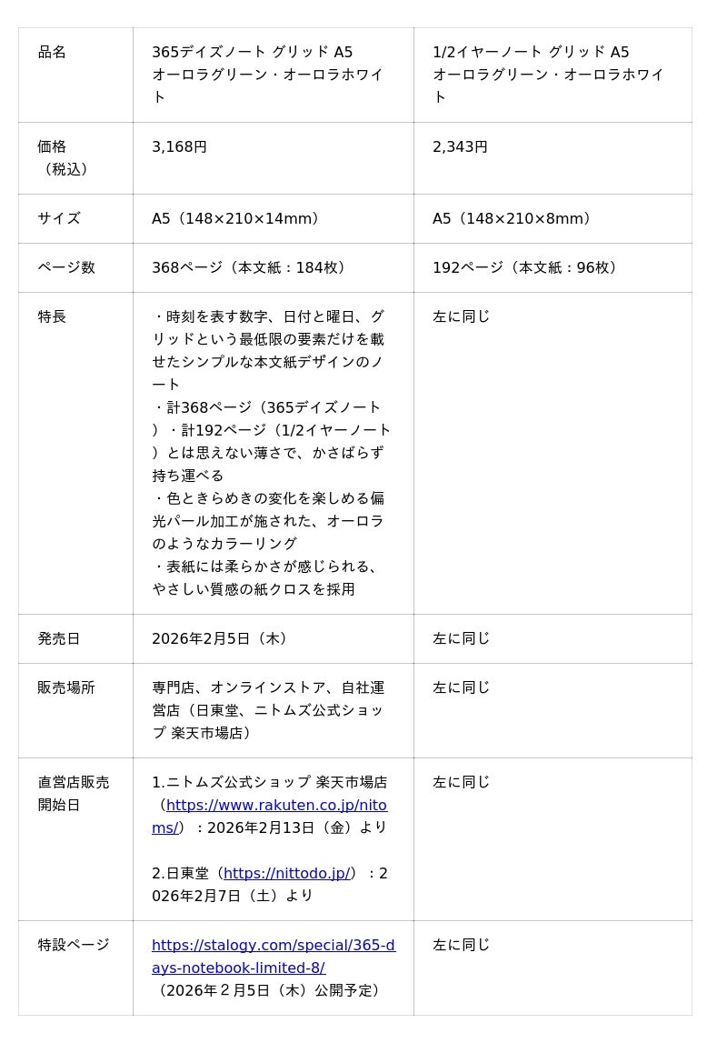 株式会社ニトムズ(本社:東京都品川区、代表取締役社長:右近敦嗣)の「ありそうで、なかったもの」がコンセプトのステーショナリーブランド『STALOGY』は、ユーザーの多彩な毎日を記録できる『365 デイズノート』『1/2 イヤーノート』の限定色(2 色)を、2026年2月5日(木)に発売します(数量限定)。
