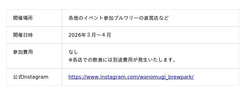 屋内型のサーキットイベントで、参加するブルワリーの直営店を中心とした日本各地で開催されます。大阪、東京、静岡、愛知、愛媛、島根など約10箇所での開催計画がすでに進行中で、イベント当日は数名のブルワーが参加予定です。イベントでは、本企画のために醸造された "日本酒酵母ビール" が各店舗で数種類提供されます。各店のイベントスケジュールは随時公式Instagramや各ブルワリー・直営店のSNSで配信しますので、ぜひご確認ください。イベント公式Instagram:@ wanomugi_brewpark