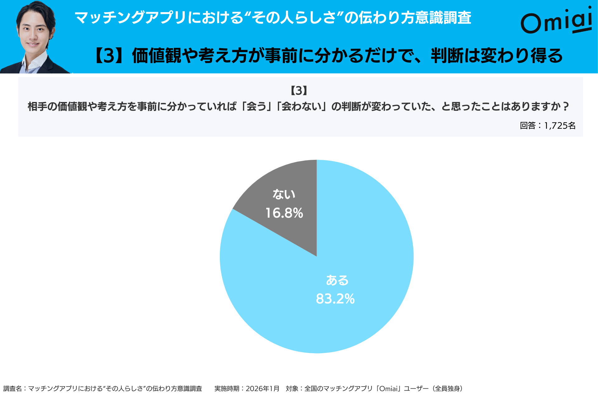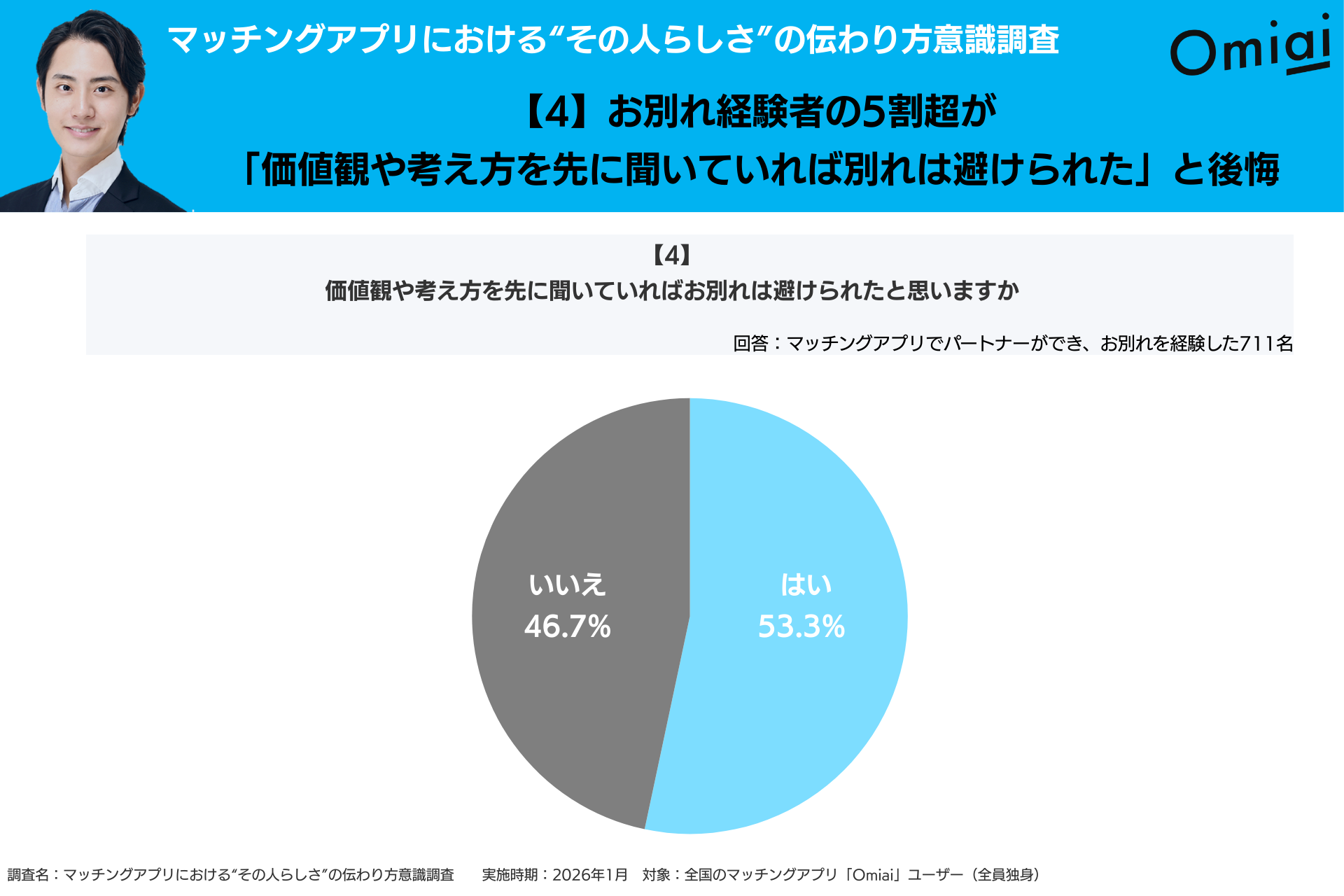 本調査では、プロフィールだけでは相手の"その人らしさ"が伝わりにくいと感じる人が86.3%にのぼり、そうした層では「会う/会わない」の判断が難しい割合が+22.9pt高い結果となりました。さらにマッチングアプリで出会ったお相手とお別れした経験がある人のうち53.3%は「価値観や考え方を先に聞いていれば別れは避けられた」と回答しました。
