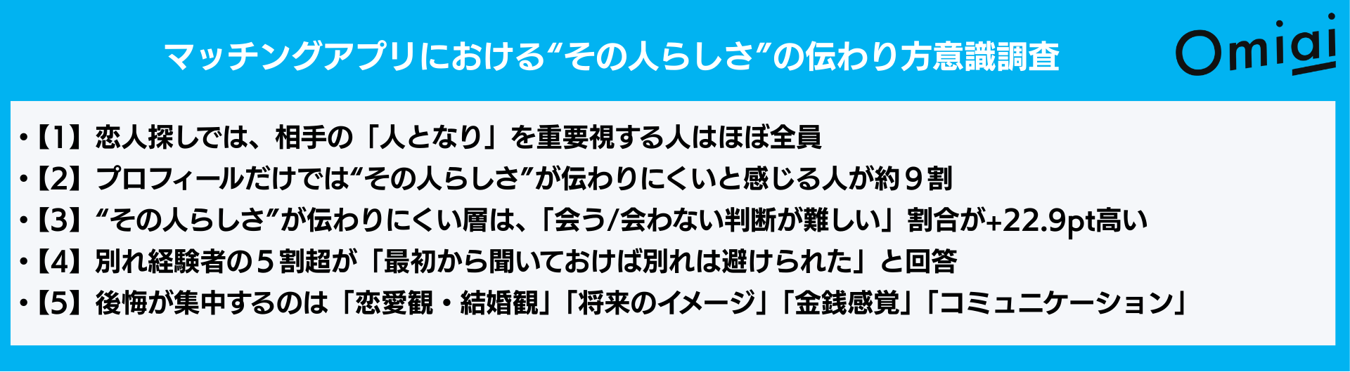 本調査では、プロフィールだけでは"その人らしさ"が伝わりにくい実態と、それが「会う/会わない」の判断の難しさにつながり得る傾向が示唆されました。また、お別れ後の後悔は「恋愛観・結婚観」「将来のイメージ」「金銭感覚」「コミュニケーション」など"らしさ"に直結するテーマに集中していました。判断に伴い心理的負担は少なからずあるものだと思いますが、「Omiai」では、出会いの「メンパ」、いわゆる心理的負担の軽減につながる体験づくりを推進してまいります。【調査概要】
