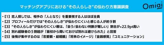 株式会社エニトグループ傘下の株式会社Omiai(代表取締役CEO:今井良樹)が運営するマッチングアプリ「Omiai」は、全国の「Omiai」ユーザーを対象に「マッチングアプリにおける"その人らしさ"の伝わり方意識調査」を実施しました。