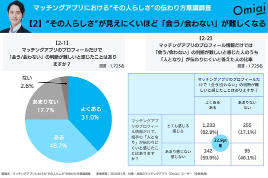 「会う/会わないの判断が難しい」と感じるのは、優柔不断さではなく、"納得して判断できる材料が揃っていない"ことが原因になり得ます。今回、"その人らしさ"が伝わりにくいと感じる層は、「会う/会わない判断が難しい」と回答する割合が+22.9pt高い結果でした。判断の負荷を下げるには、会う前に"らしさ"が伝わる情報の解像度を上げることが重要だと考えています。