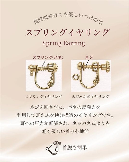 耳への圧力が軽減され、ネジバネ式イヤリングに比べて痛くなりにくいのが特長。