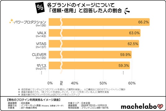 上位5ブランドの結果を見ると、『パワープロダクション』が66.2%で最も高い数値となりました。次いで『VALX』が63.0%、『VITAS(バイタス)』が62.5%、『CLEVER(クレバー)』が59.9%、『ザバス』が59.3%と続きます。