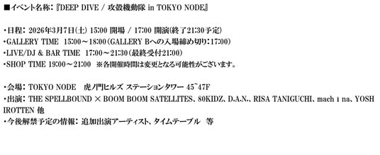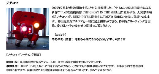 攻殻機動隊展 Ghost and the Shell 製作委員会(株式会社講談社、森ビル株式会社、KDDI株式会社、株式会社プロダクション・アイジー、株式会社パルコ、株式会社バンダイナムコフィルムワークス)は、2026年1月30日(金)から4月5日(日)まで、虎ノ門ヒルズ ステーションタワー45Fの情報発信拠点「TOKYO NODE(東京ノード)」内 TOKYO NODE GALLERY にて開催する『攻殻機動隊展 Ghost and the Shell』内で開催されます、作品公式の音楽イベント『DEEP DIVE / 攻殻機動隊 in TOKYO NODE』の情報解禁第二弾として、出演アーティスト第一弾およびイベント特別キービジュアル、チケット詳細を公開いたしました。