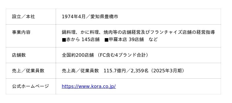 鍋料理の「赤から」や、老舗かに料理専門店「甲羅本店」を展開する株式会社甲羅(本社:愛知県豊橋市、代表取締役社長:沼澤 裕)は2026年3月4日(水)~6日(金)の3日間、東京ビッグサイトにて開催の「フランチャイズ・ショー2026」に「赤から」ブースを出展します。今後の「赤から」店舗拡大を目指し、「赤からでしか体験できない価値」に共感し、パートナーシップを築いていただけるフランチャイズ加盟オーナー様を募集いたします。