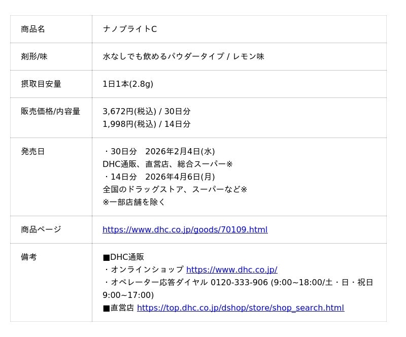 株式会社ディーエイチシー(本社:東京都港区、代表取締役社長:宮崎緑、以下:DHC)は、話題のリポソーム技術※1を採用したビューティサプリメント「ナノブライトC」を2026年2月4日(水)から順次発売いたします。吸収効率を追求したこだわりの極小カプセル"超吸収リポソーム"を採用し、効率よくビタミンCのパワーを体内に届けます。"届ける"発想のビタミンCで、内側からのキレイをサポートします。