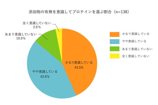 「添加物の有無を意識してプロテインを選ぶ」と回答した人は86.3%。内訳は「かなり意識している」43.5%、「やや意識している」42.8%。「あまり意識していない」「全く意識していない」は13.8%にとどまりました。