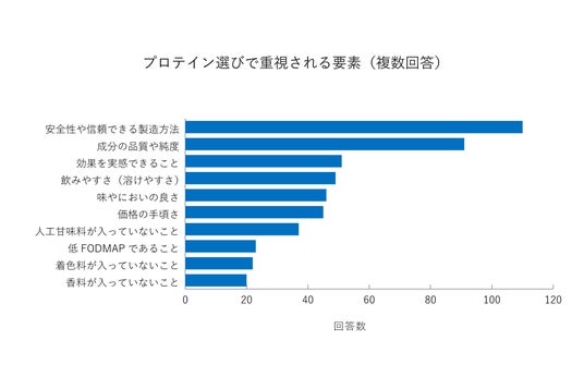 理想のプロテインについては、「安全性や信頼できる製造方法」を求める声が最も多く、次いで「成分の品質や純度」となりました。