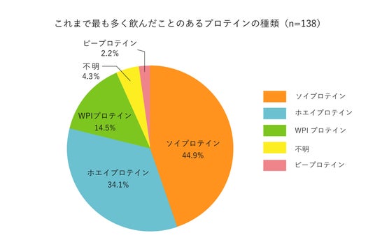 これまで最も多く飲んだことのあるプロテインの種類について聞いたところ、「ソイプロテイン」が44.9%と最も多く、「ホエイプロテイン」(34.1%)、「WPIプロテイン」(14.5%)が続いた。植物性・動物性いずれのプロテインも一定の支持を集めました。