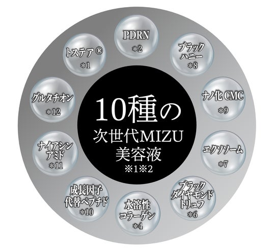 1. 10種の次世代MIZU美容液※1※2配合トステア(R)︎*1やPDRN*2などの成分が浸透※3。