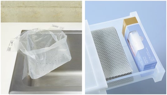 ヒビフル第6弾(左)大容量で交換の手間が減る 吊り下げられるペーパータオル (右)シンクに貼って浮かせる 三角コーナーがいらない水切り袋