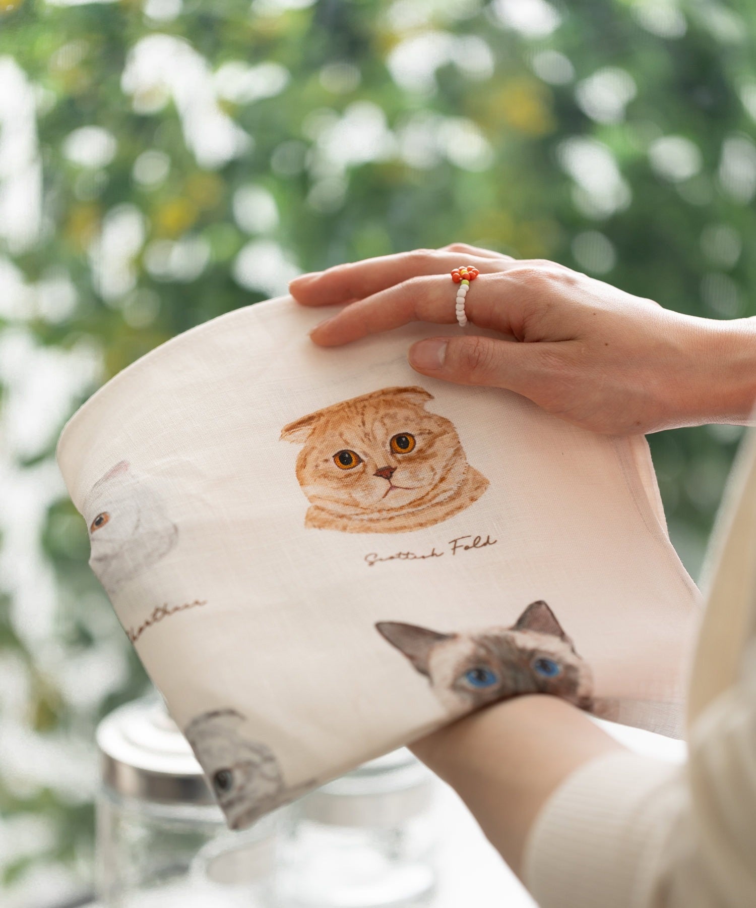 大きめリネン100%ハンカチ キャット&ドッグ 43×43cm