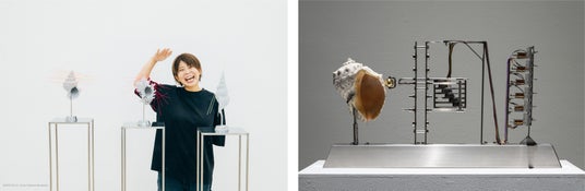 自然の力と機械構造が交差する瞬間に着目し、環境に呼応して動く彫刻作品を制作しています。貝殻や羽根といった生物の抜け殻を用い、自然由来の素材と金属による機械的な要素を組み合わせることで、作品は風や太陽光、雨などの移ろう自然エネルギーを受けながら、揺れ、振動し、かたちを変えていきます。
