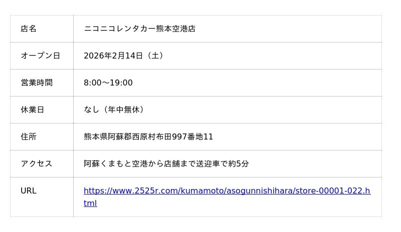 株式会社MIC(本社:神奈川県横浜市、代表取締役:増田信夫)は、2026年2月14日(土)「ニコニコレンタカー熊本空港店」をグランドオープンいたします。2026年1月13日(火)に移転リニューアルオープンした「ニコニコレンタカー成田空港店」に続き、2026年に2店舗目のオープンとなります。