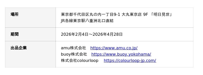 本実証は、2025年にスタートしたリバネスと東京建物が推進する「リジェネラティブ・シティ実証プロジェクト※2」の第二弾となるものです。リジェネラティブ・シティ実証プロジェクトに共感いただいた大丸東京店内の複合型体験ストア「明日見世」内で実施します。「あなたの選択が、豊かさのめぐりを紡ぎ出す」をコンセプトに選出されたスタートアップ10社の中から、3社のリジェネラティブな製品を2026年2月4日より展示・販売します。