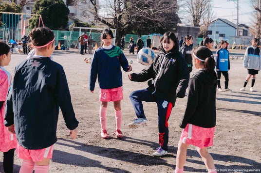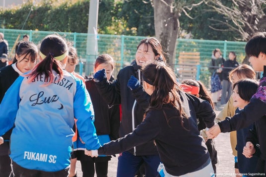 大会前には、ノジマステラ神奈川相模原 トップチーム選手との交流会を実施。南里杏選手、根府桃子選手、築地育選手、白井ひめ乃選手、三谷碧葉選手、明詩音梨選手が参加し、各チームに選手が加わる形で、目隠しウォークと円リフティングを通じて交流を深めました。