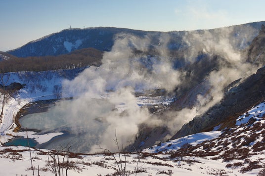 森を抜けた先に広がるのは、真っ白な雪原の中で激しく湯気を上げる大湯沼。氷点下の澄んだ空気と、地底から湧き出る熱気が生み出すコントラストは、冬の登別でしか出会えない特別な体験です。