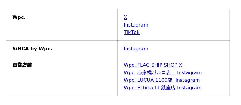 展開ブランド :Wpc. / W by Wpc. / Wpc. IZA / SiNCA by Wpc. / ONDOO by Wpc. / Wpc. Patterns / UVO / go-koh / KiU / VEER / L.o.F. design / GUERRILLA by KiU