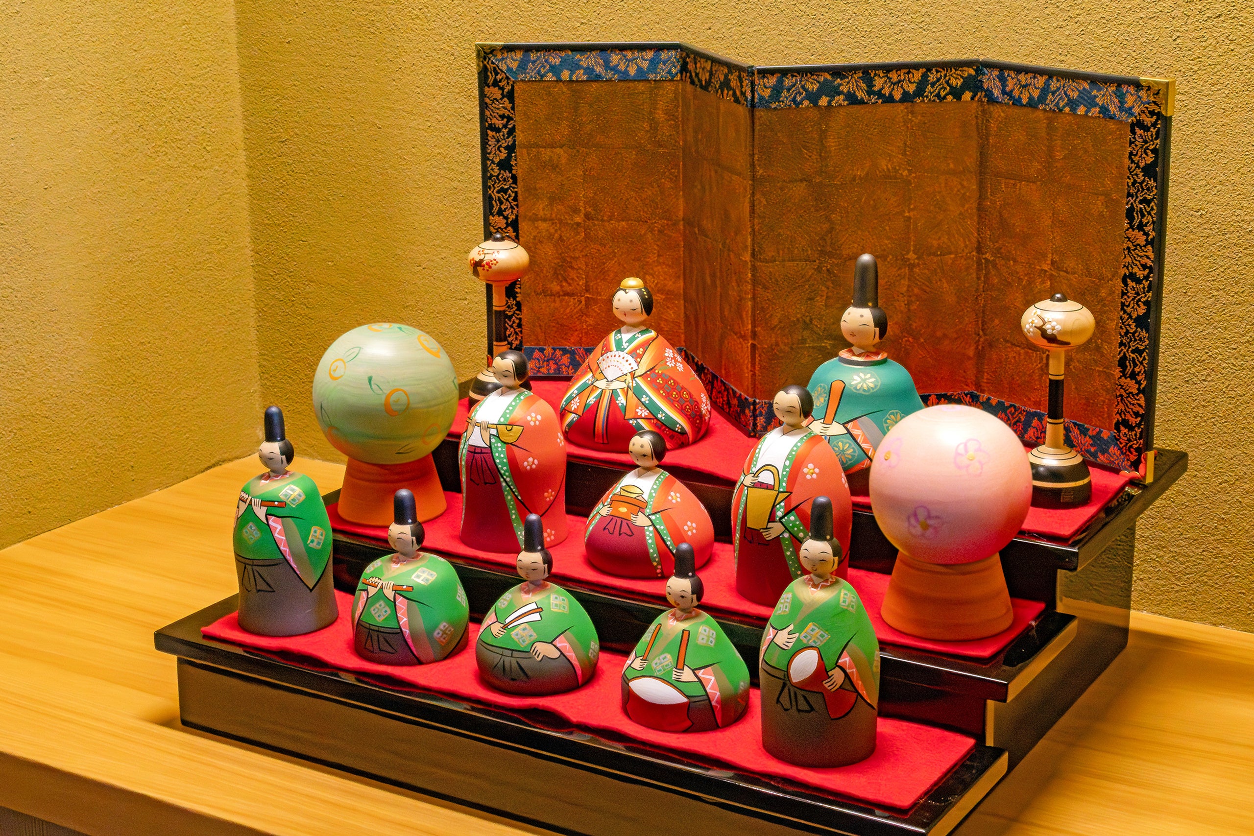 ホテルロビーには、ふたつの異なる雛人形と雅な風情が漂う色打掛、そして健やかな成長を祈るつるし飾りを展示し、フォトスポットとして来館される皆様をお迎えします。京で生まれた雛人形は江戸時代までは男雛が向かって右側に置かれていました。明治時代に西欧式の礼法を取り入れたことから、徐々に左右が逆になり大正時代には完全に入れ替わったと言われています。近代の雛人形は向かって左に男雛を配していますが、歴史あるものや京雛は古式に倣い右側に配した飾り方が伝わっています。今回の展示では、東と西(京)雛としてふたつの段飾りを展示し、それぞれの魅力をお愉しみいただきます。京雛は、五人囃子ではなく七人楽人と雅な景色をご覧いただけます。
