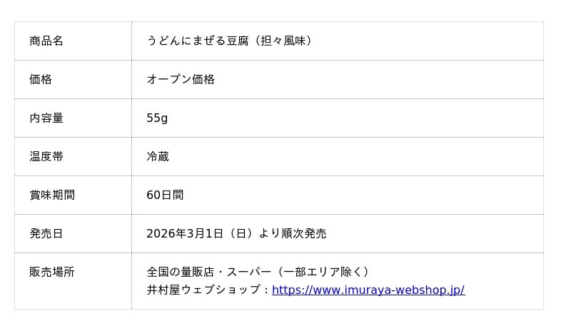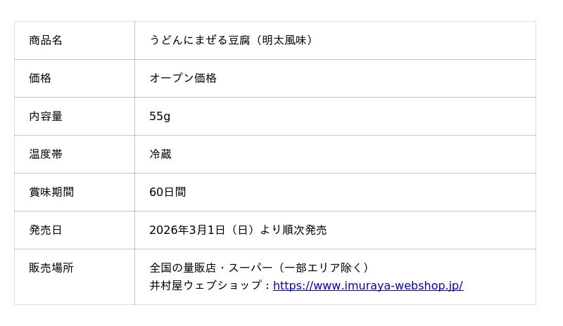井村屋株式会社(本社:三重県津市高茶屋七丁目1番1号、社長:岩本 康)は、うどんにまぜて食べる新感覚の豆腐として、『うどんにまぜる豆腐(明太風味)』と『うどんにまぜる豆腐(担々風味)』を、2026年3月1日(日)より全国(一部エリアを除く)で新発売します。