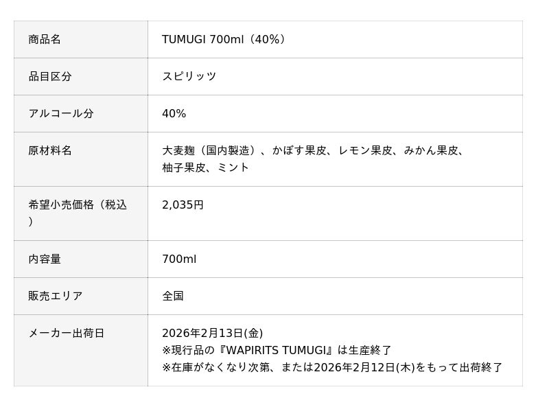 三和酒類株式会社(本社:大分県宇佐市 / 社長:西和紀)は、 ニッポン発のカクテルベーススピリッツ『TUMUGI』を2026年2月13日(金)より、リニューアル発売いたします。現行品の『WAPIRITS TUMUGI』は、商品リニューアルに伴い生産を終了し、在庫がなくなり次第、または2026年2月12日(木)をもって出荷終了といたします。