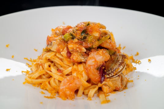 魚介と菜の花のトマトソースの自家製タリオリーニ カラスミ掛け