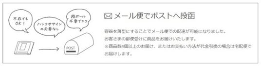 製品パッケージを小型にすることで、メール便での商品発送を可能としています。これによって配送に伴う環境負荷を低減するだけでなく、お客さまの受取り時の利便性も向上しています。