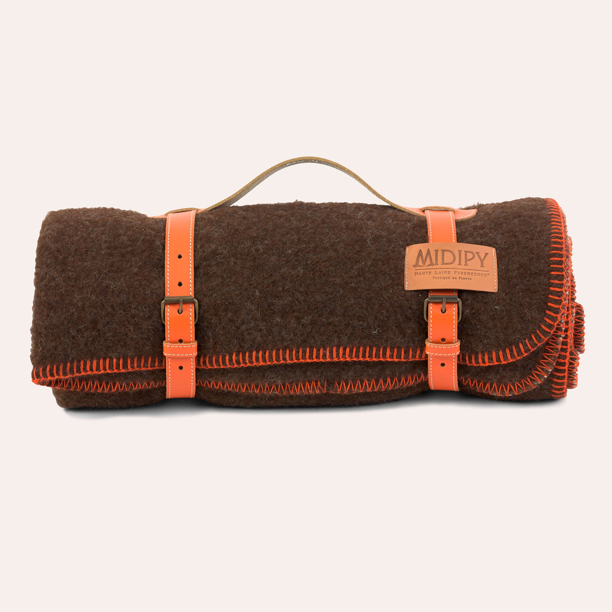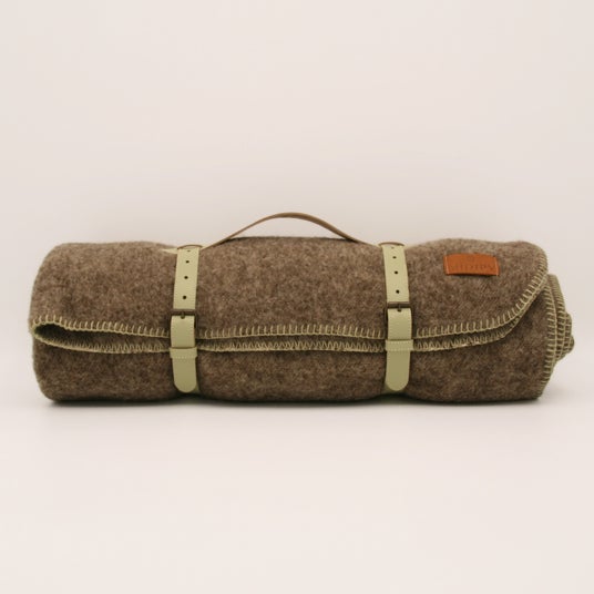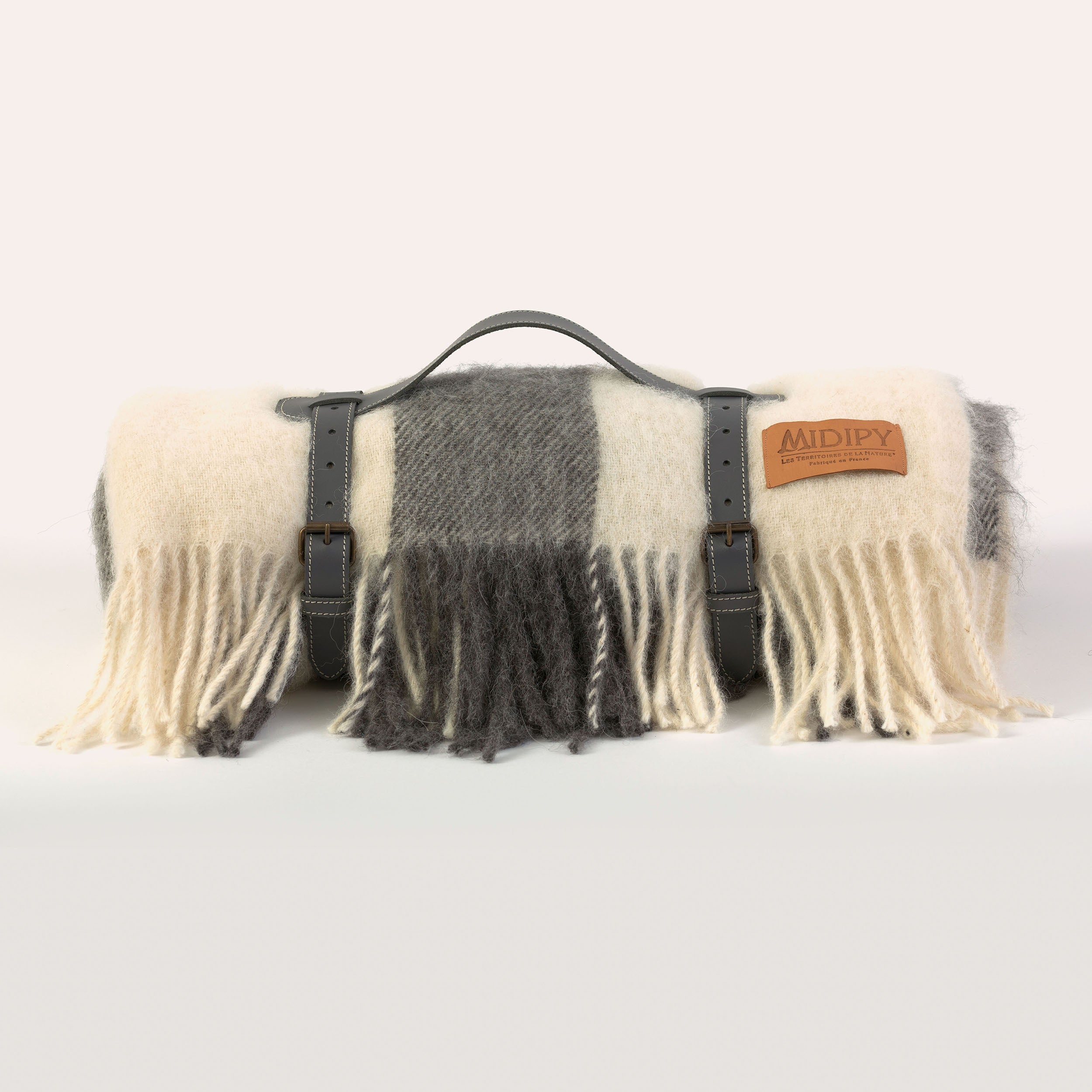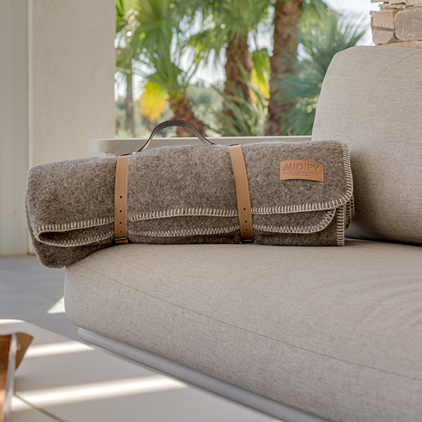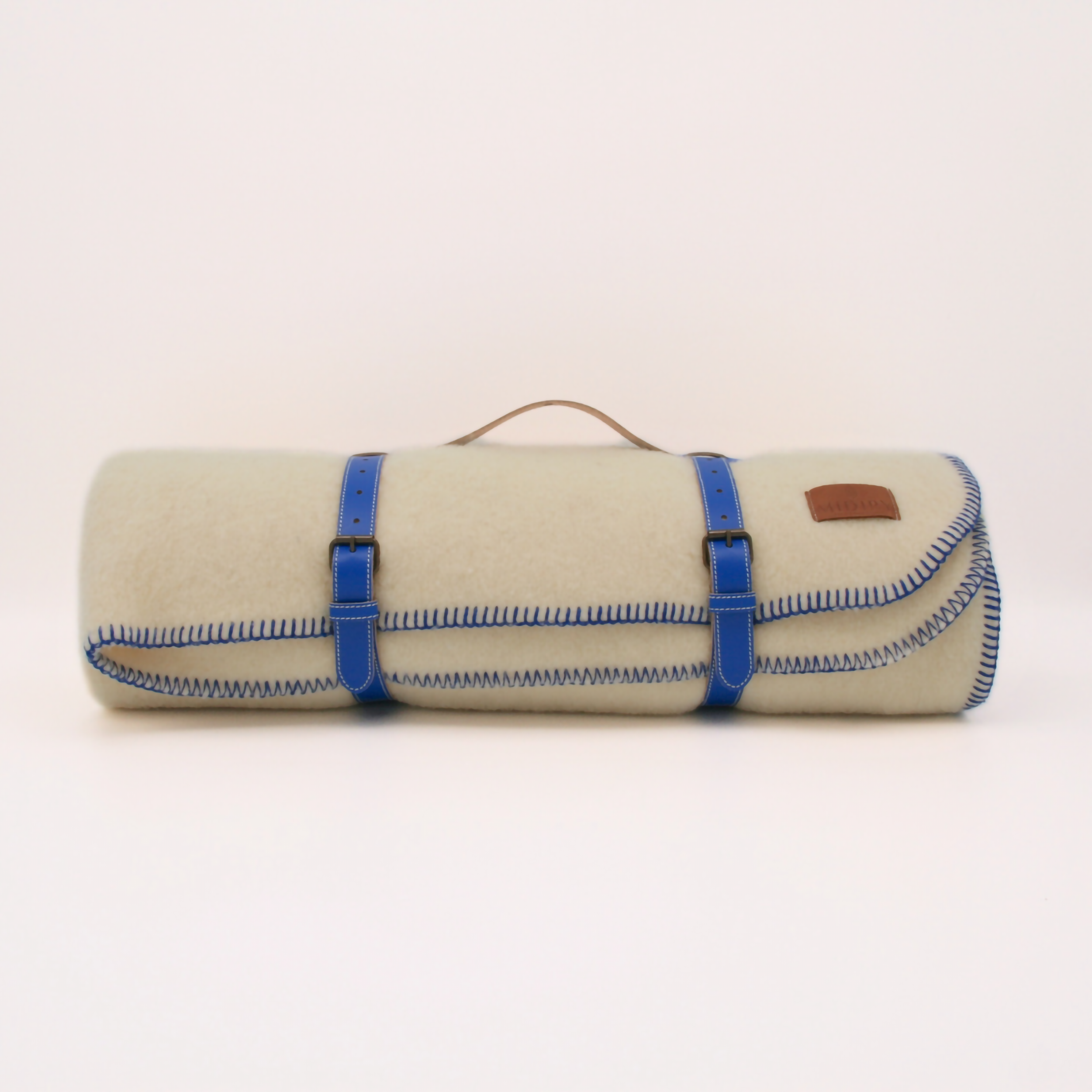 ナチュラルでやわらかいカラーの布地に、縁を彩るカラフルなステッチとレザーベルトがさりげない個性を添えます。柔らかく包み込んでくれる暖かさはもちろん、使わないときは丸めてベルトで留めることで、インテリアの一部としても映えます。ハンドル付きのベルトは、室内外を問わず、気軽に持ち運びができるのもポイント。