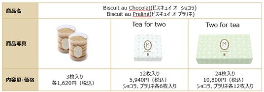 ミルクショコラをサンドした「Biscuit au Chocolat(ビスキュイ オ ショコラ) 」と、ナッツが香ばしいプラリネをサンドした「 Biscuit au Praline(ビスキュイ オ プラリネ) 」の2種類の味をご用意しました。BOXは、1920年代の舞台挿入歌として作曲され、1950年代にミュージカル・コメディ『Tea for two(二人でお茶を)』で人気となった歌、『Tea for two』からインスピレーションを受けてデザインされています。
