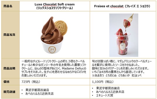 ※2:リュクスショコラソフトクリーム:東武宇都宮百貨店(栃木)、あべのハルカス近鉄本店(大阪)、デパートリウボウ(沖縄)、フレイズ エ ショコラ:東武宇都宮百貨店(栃木)、エキュート大宮(埼玉)、あべのハルカス近鉄本店(大阪)