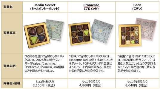 今年のバレンタインコレクションは、"『Love Gate』"をテーマに、扉の向こうに広がるショコラの庭園を表現しました。 2026年新作ショコラは、ストロベリーガナッシュをダークチョコレートでコーティングした「Fraise(フレイズ)」をはじめ、ジャスミンフレーバーのキャラメルをミルクチョコレートでコーティングしたJasmin(ジャスマン)」、香ばしいピスタチオのプラリネをホワイトチョコレートでコーティングした「Pistache(ピスタシュ)」、バニラのガナッシュをミルクチョコレートでコーティングした「Vanille(バニーユ)」計4種類が登場し、3種類のアソートボックスを用意いたしました。原材料やショコラの品質にこだわりつくりあげた新作ショコラの数々、創業者マリーのショコラへの想いをのせた特別商品をお楽しみいただけます。