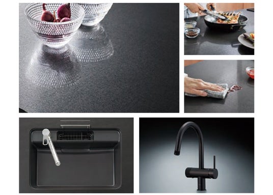 ■システムキッチン(一部抜粋)焼き物ならではの趣のある表情と熱やキズ、汚れに、優れた耐久性を発揮するセラミックトップ。美しさと使いやすさを兼ね備えた、上質な佇まいと品格のあるキッチン。