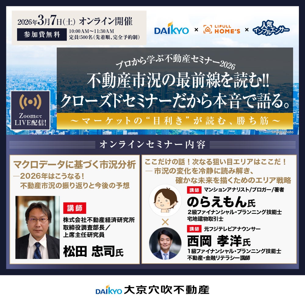 株式会社大京穴吹不動産(本社:東京都渋谷区)は、2026年3月7日(土)にオンラインにて『プロから学ぶ不動産セミナー 2026 不動産市況の最前線を読む!!クローズドセミナーだから本音で語る。~マーケットの"目利き"が読む、勝ち筋~』を株式会社LIFULLと共同開催いたします。ゲストに株式会社不動産経済研究所の松田忠司氏、マンションアナリストののらえもん氏と元フジテレビアナウンサーの西岡孝洋氏を迎え、「マクロデータに基づく市況分析」や「ここだけの話!次なる狙い目エリアはここだ!」をテーマに語っていただきます。オンライン開催で参加費無料、事前予約制です。