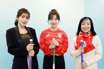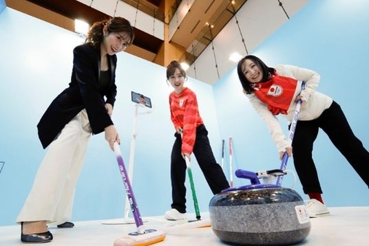 本田望結さん、レインボーさん、ロコ・ソラーレ藤澤五月さん、司会の中川安奈さんらが競技を擬似体験しながら劇的瞬間を撮影できる施設を体験!