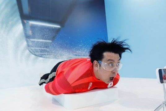 『プリントスタジアム』では、スキージャンプ、モーグル、カーリング、スノーボード、スケルトンの全5種目の撮影ブースを用意。その中から特別に、スケルトンの撮影体験のデモンストレーションをステージ上で実施しました。体験にはレインボージャンボさんが参加し、正面から風を浴びながら、臨場感あふれるスケルトンの体験にジャンボさんは「ちょっと待って!思ったよりすごい。口の中の水分がない!」と大きく手を広げ、まるで宙に浮いているかのような動きを見せました。池田さんが「カップルも家族もみんなで楽しめる体験になっている。」とコメントし、会場は大きな盛り上がりを見せました。