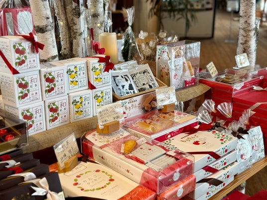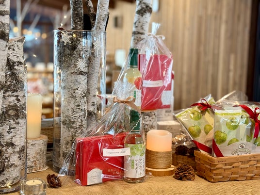 飯綱高原に自生する白樺を使用した、冬らしい装いで飾った空間の中で、信州ならではのおすすめ商品を多く取りそろえました。