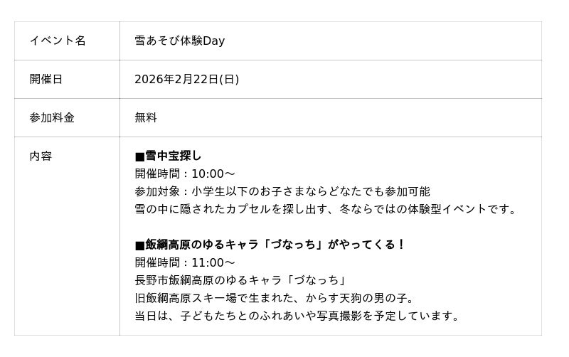 県内のお客様はもちろん、観光で長野を訪れる方や家族連れ・カップル層にも、冬の飯綱高原の魅力を存分に体感していただける内容となっています。