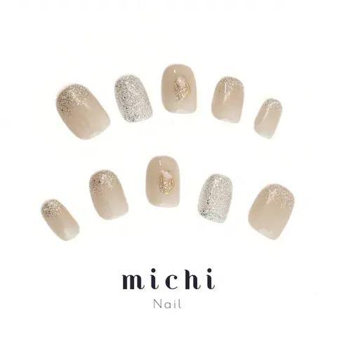 2種類のフラッシュジェルと少し大きめのグリッターをミックスし、上品にキラキラ輝くデザインに仕上げました。シアーなベージュカラーをベースに、中指にはさりげないマーブルアートを施し、大人の落ち着きと華やかさを両立しています。