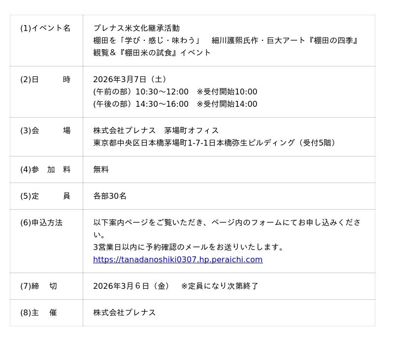 このたび、3月7日(土)、プレナス茅場町オフィス(中央区日本橋茅場町)にて、細川護熙氏作・巨大アート『棚田の四季』観覧&『棚田米の試食』イベントを午前と午後の2回、無料で開催いたします。