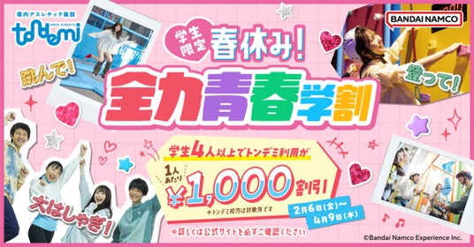株式会社バンダイナムコエクスペリエンスが企画・プロデュースする屋内アスレチック施設『トンデミ』の対象店舗(※1)にて、2026年2月6日(金)~4月9日(木)の期間、「春休み!青春全力学割」を実施します。